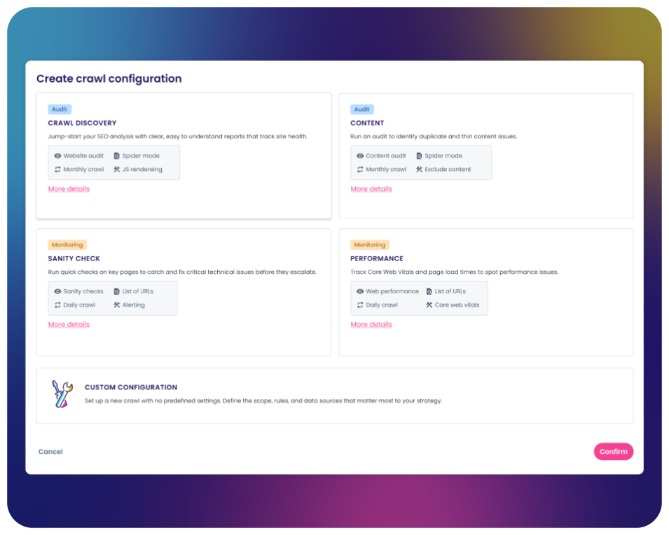 The Crawl Discovery Lens eliminates the guesswork when it comes to analyzing your site’s structure. The lens maps your SEO funnel, highlighting key issues across your site that prevent pages from surfacing in search results. Build a solid technical foundation, faster.