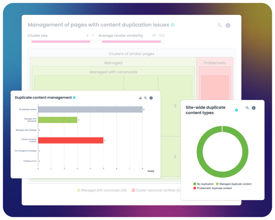 Discover how similar your pages are to one another, and whether or not your rankings in search engines are impacted. Prioritize improvements based on this knowledge, and be confident you’re spending your time and effort on changes that will move the needle.
